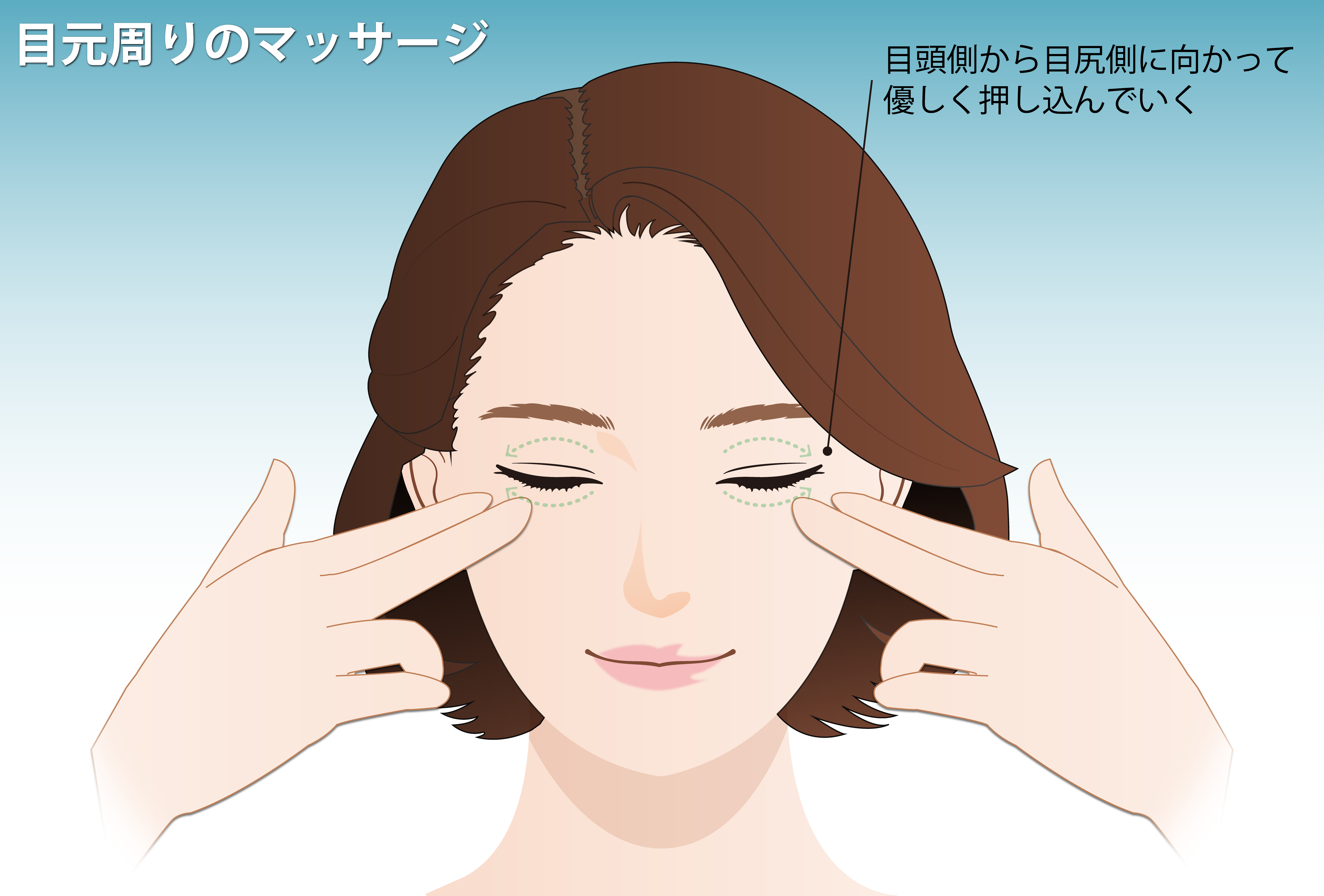 目もと周りのマッサージは、血行やリンパの流れを促します。むくみの軽減への効果も期待できるでしょう。具体的なマッサージ例は、以下のとおりです。