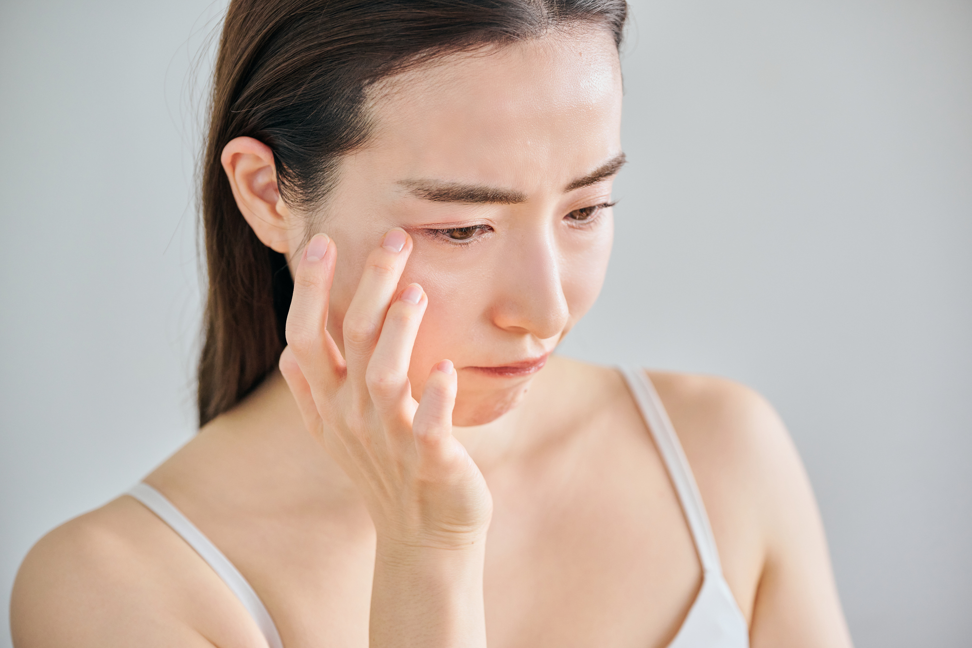 また、目もとだけでなく頬の皮膚が下がることで、相対的に目の下のふくらみが強調され、たるみが目立つケースもあります。日常的に目もとを強く擦る癖がある場合も、皮膚にダメージを与え、たるみを助長する原因となるため注意が必要です。