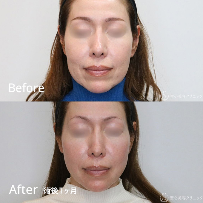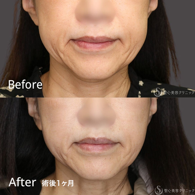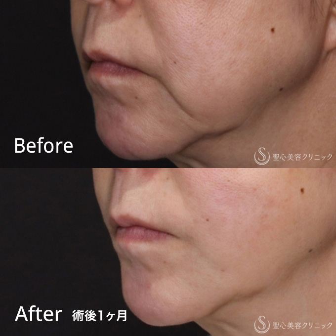 ほうれい線にプレミアムPRPを注入し張り感を出し、その1年後にアンカーMAXにてフェイスラインの緩みを引き上げています。