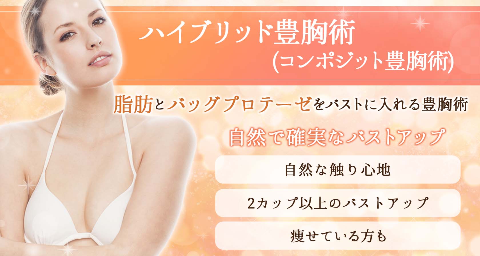 ハイブリッド豊胸術(コンポジット豊胸術)とは、バッグプロテーゼと脂肪の両方を胸に入れることでバストアップする豊胸術です。土台となるバッグプロテーゼを脂肪でカバーすることでバッグプロテーゼのボリュームと脂肪の柔らかさを活かすことができます。