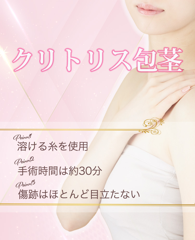 包皮がない人というのはいませんが、覆い被さっている包皮の量には個人差があります。クリトリスに皮が被さっている状態を長く続けていると、分泌物やアカがたまり臭いの原因ともなります。また性交時の痛みや不感症の悩みから治療を希望する方も多い施術です。