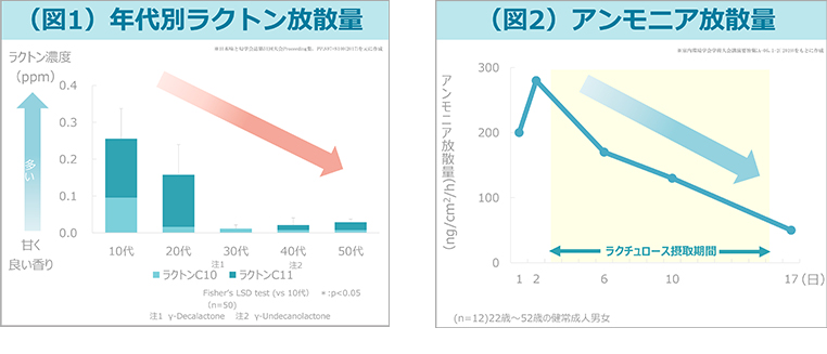 ラクトンの放散量は、20代以降急激に減少してしまいます。(図1)