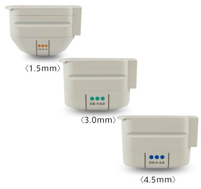 ドクターハイフ(ウルセラシステム)は、部位に応じてトランスデューサー(変換器)を変えて照射を行います。焦点距離(深さ)は「1.5mm」「3mm」「4.5mm」の3種類あります。