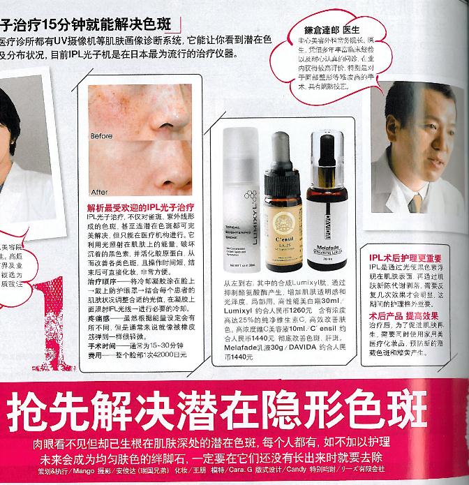 中国版GLAMOROUS(瑞丽女性网:2011年3月号)の特集”隠れシミ対策”にて、鎌倉統括院長が取材を受けました。また、当院で取り扱っているメディカルコスメが紹介されました。