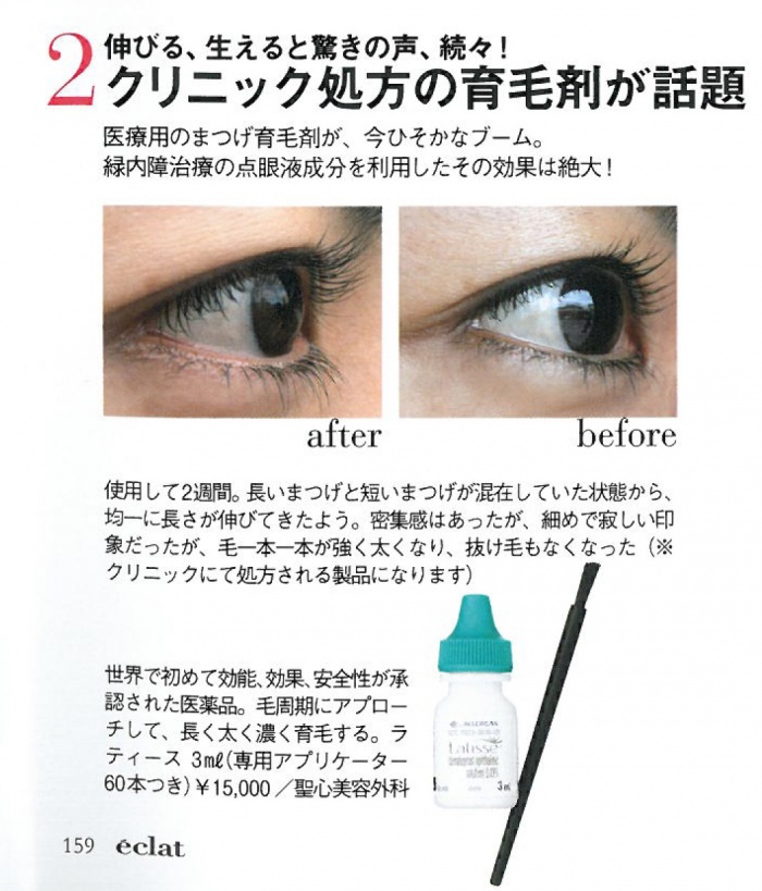 eclat(1月号)の “若見えをかなえる!まつげフサフサ計画”特集ページ にて、当院で取り扱っている「医療用まつげ育毛剤」が紹介されました。