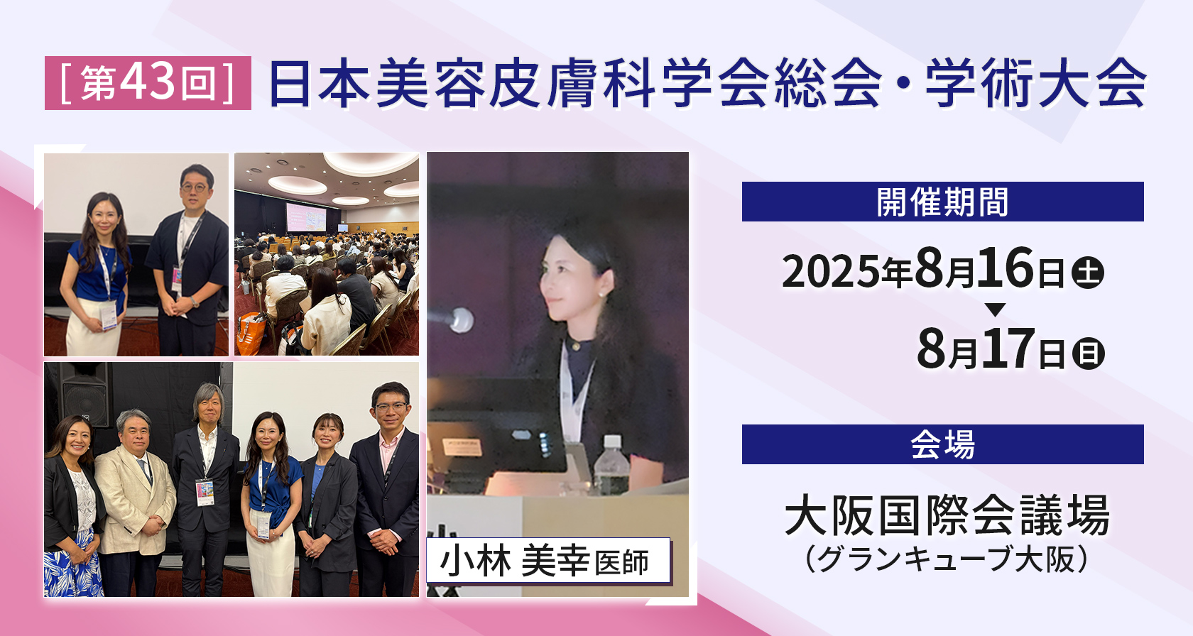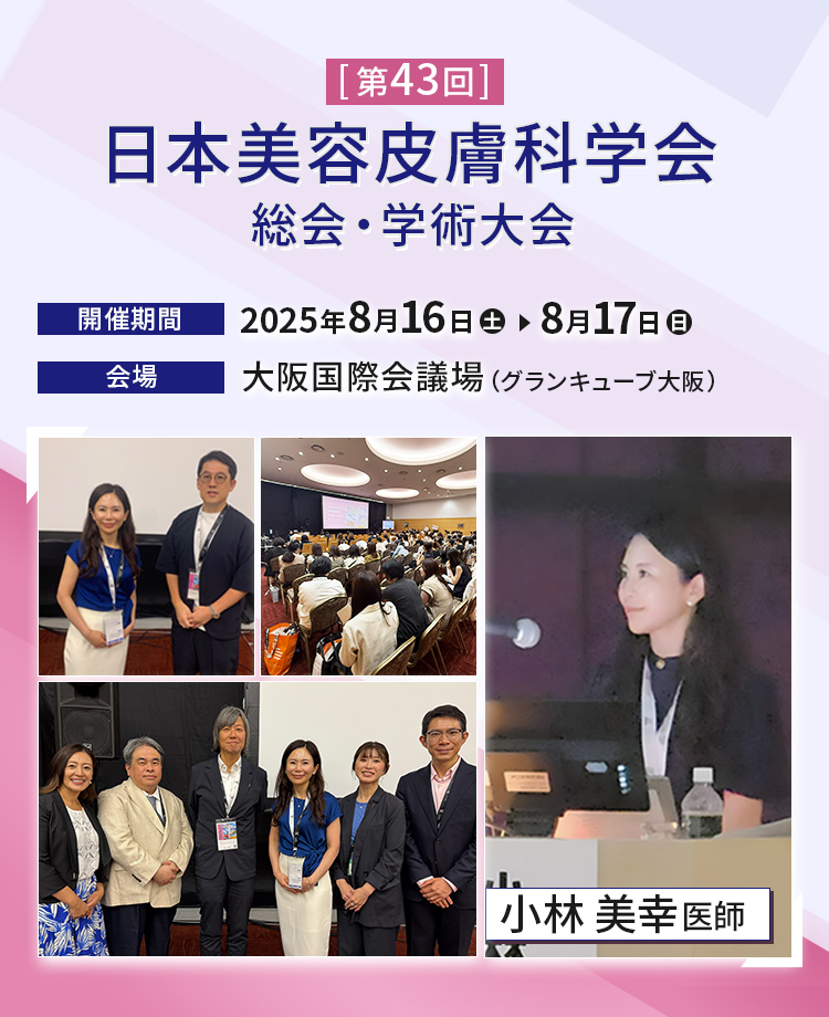 2025年8月16日(土)、8月17日(日)の2日間に、大阪国際会議場(グランキューブ大阪)とリーガルホテル大阪にて開催された「第43回 日本美容皮膚科学会 総会・学術大会」において、当院の小林美幸医師(熱海院)が発表を行いました。